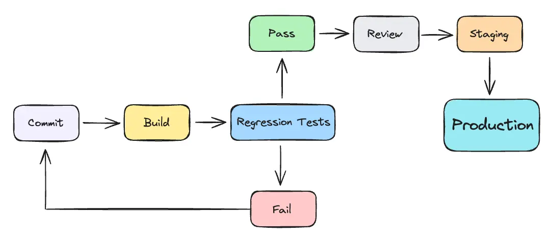 As you can see, if regression tests pass, the code is sent to the review stage and subsequently merged into production. If the tests fail, the developer must return to the code and create a passing build.