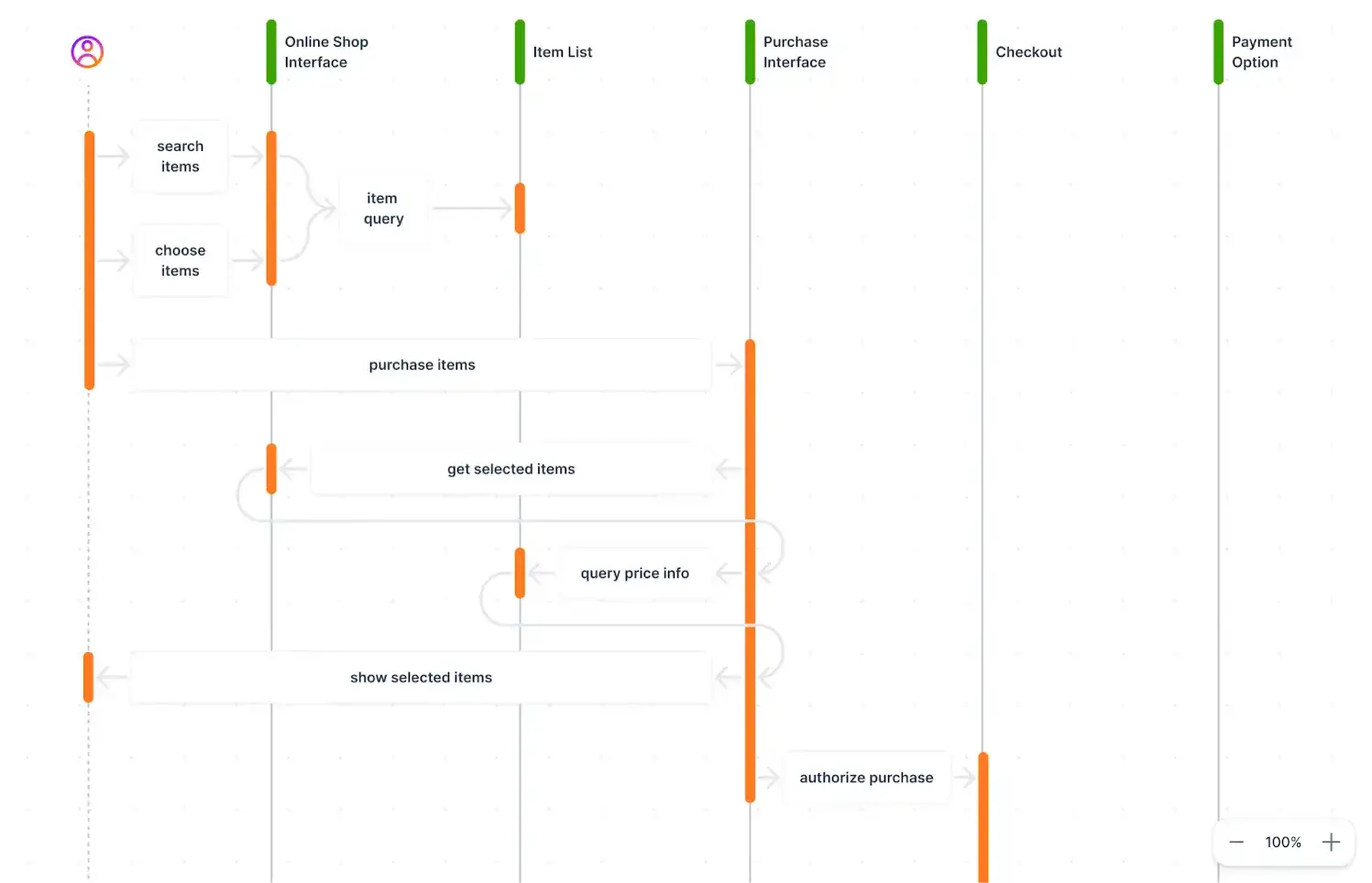 In a sequence diagram, vertical lines–or lifelines–represent the objects or components involved in the interaction. Horizontal arrows between lifelines indicate messages being passed between them, with the sequence of messages reflecting the execution order. Depending on the timing and nature of the interaction, messages can be synchronous, asynchronous, or recursive.