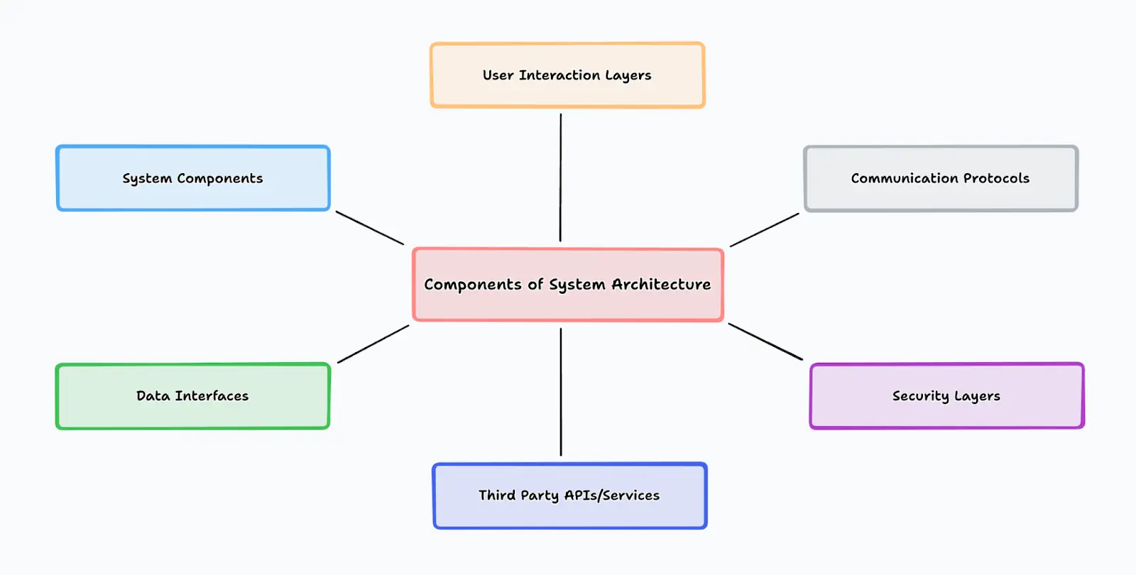 | Components of a system architecture | System architecture encompasses all aspects of a system, such as software, hardware, data, interfaces, communication protocols, third-party services/APIs, user interactions, and security layers. |