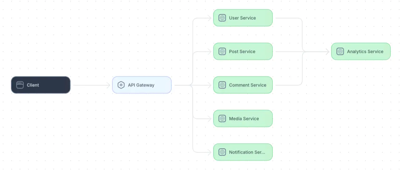 - Advantages: Scalability, fault isolation, independent deployments, and smaller, more manageable codebases. If there are issues with one service, such as news feed generation, these issues are isolated and do not cause the entire platform to fail.