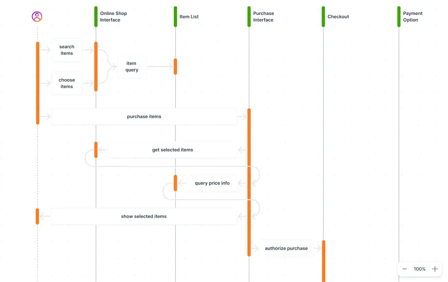 Use sequence diagrams for a more specific look at system functionalities. These diagrams depict the interactions between services in responding to queries, handling user authentication and authorization, and delivering resources. The sequence diagram below shows the order placement process of an online store.