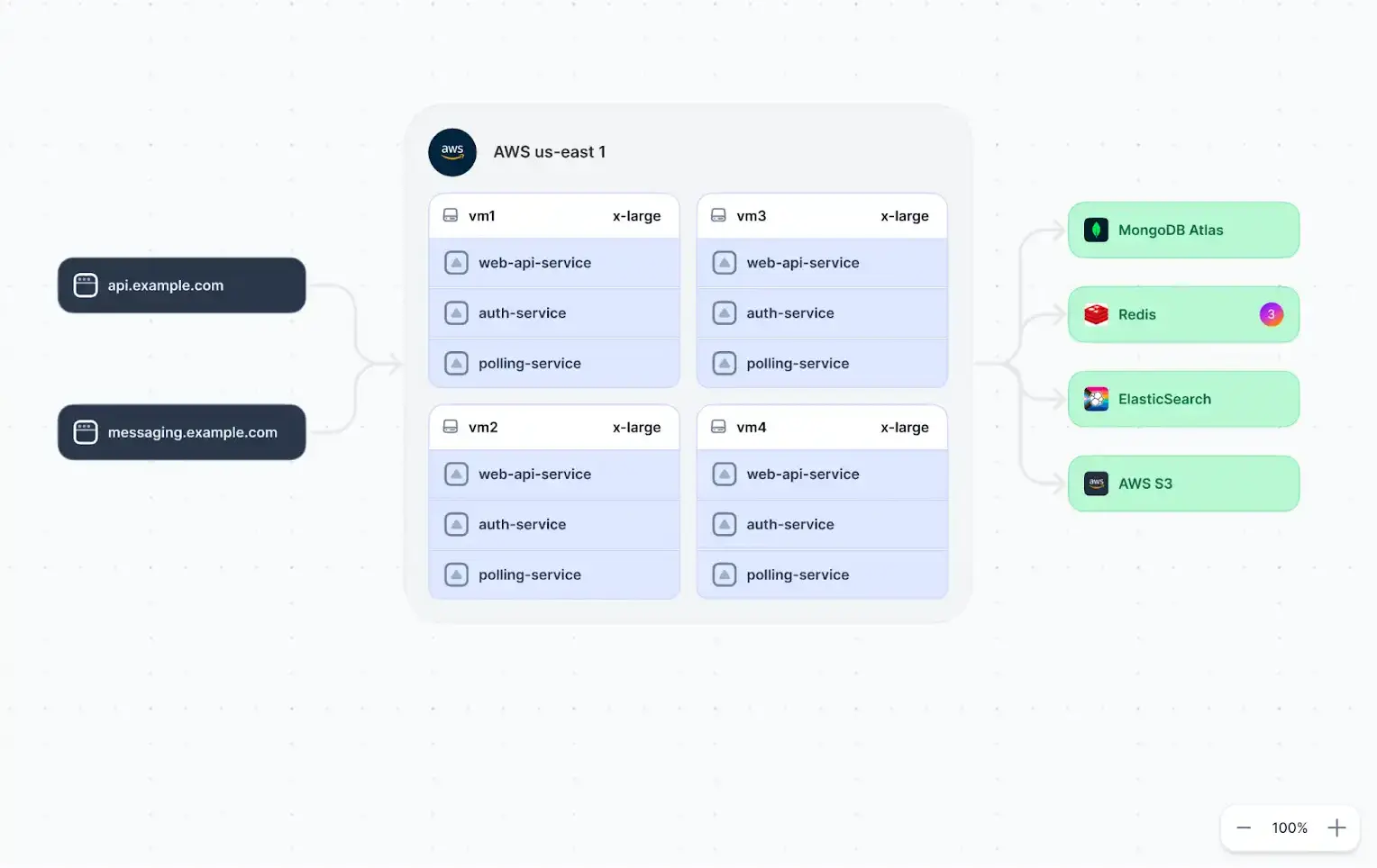 The network diagram below shows the types of computing resources hosting each service and the relationships between the application’s internal API and third-party services.