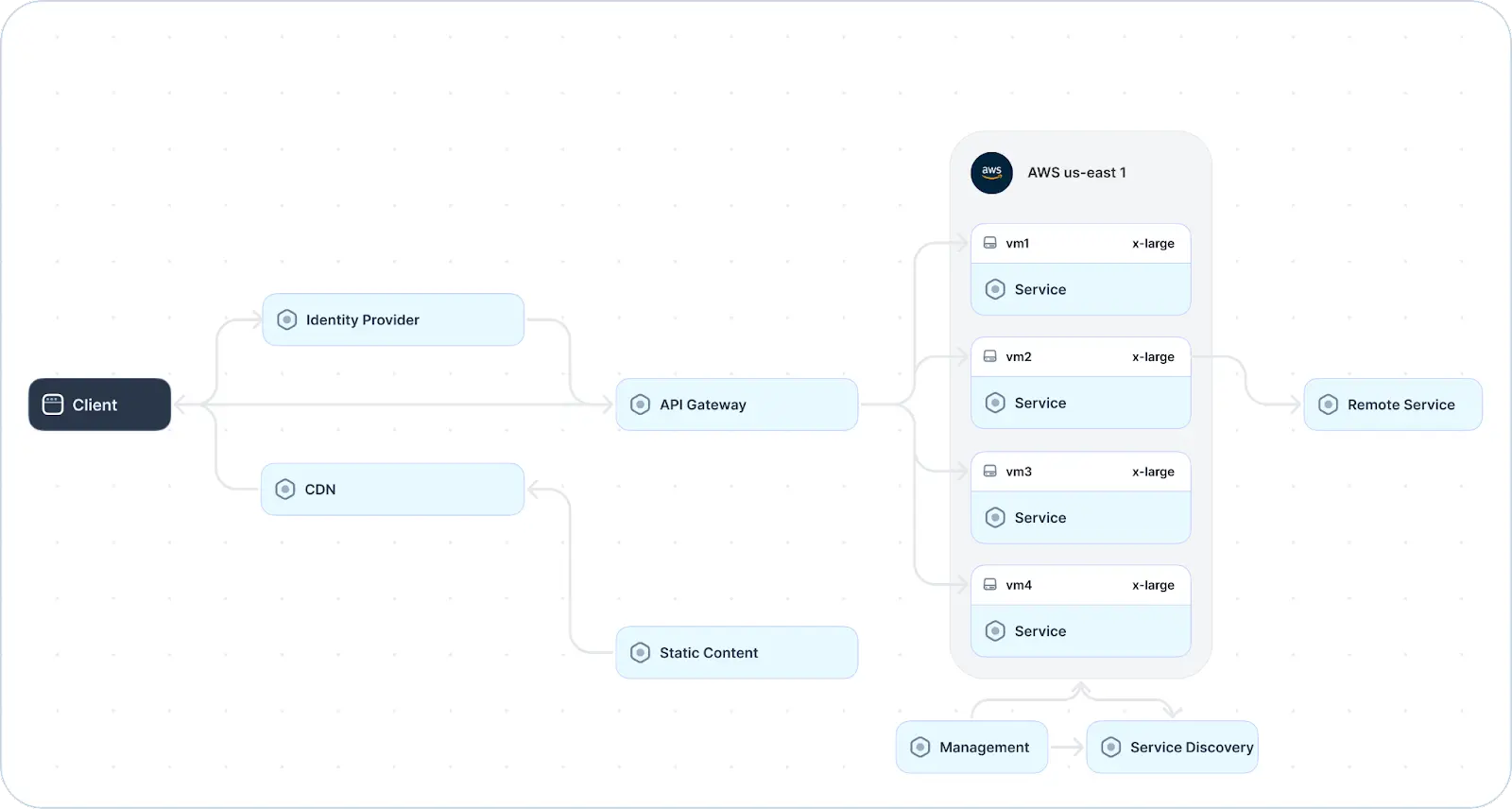 The diagram above shows the primary components of a system from a networking perspective. It showcases the logical relationships and interactions between elements such as the content delivery network (CDN), API gateway, service registry, and container orchestration platform. Other elements to consider include the IP addresses and physical locations of different computing resources.