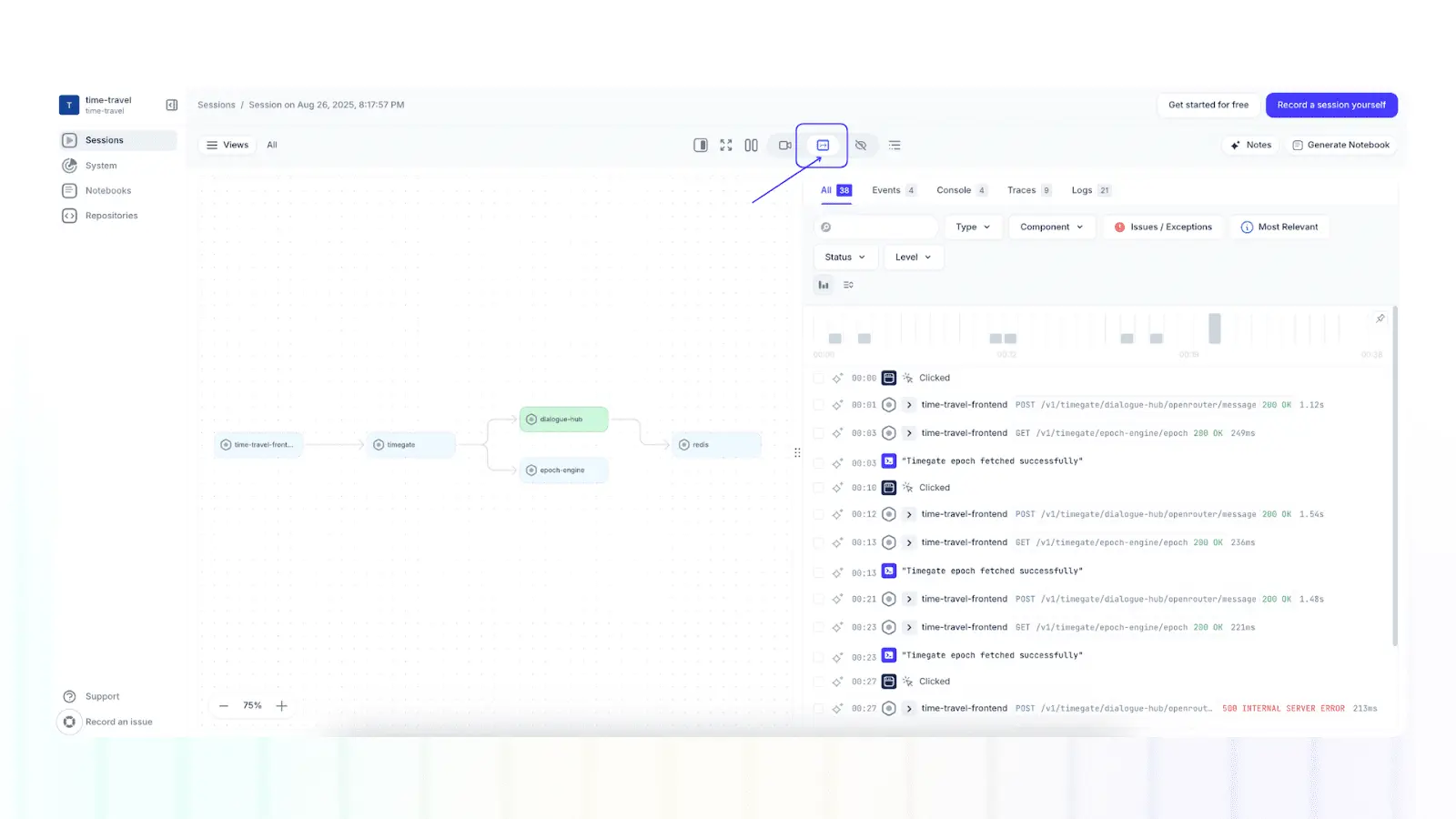 The result is a living architecture view that ties together the full stack. Teams can view a map of the system components and dependencies involved in a specific session recording, and they can use insights from recordings to ensure architecture diagrams remain up to date, actionable, and reflect real-world behavior.