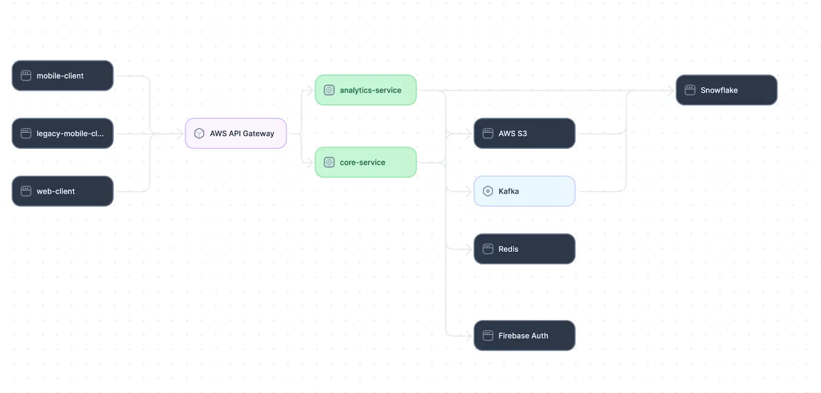 | Application dependency mapping example | Modern systems include a variety of software components, such as public web and mobile clients, private internal core APIs, analytics servers for logs and metrics analysis, message brokers, and third-party SaaS integrations. In this context, application dependency mapping serves as a reference in discussions with both technical and non-technical personnel. |