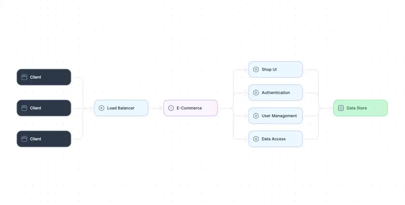 Utilize system architecture diagrams to offer a high-level view of a system's design, focusing on the relationships and interactions between its major components. The system architecture diagram below shows the major components of a monolithic e-commerce platform.