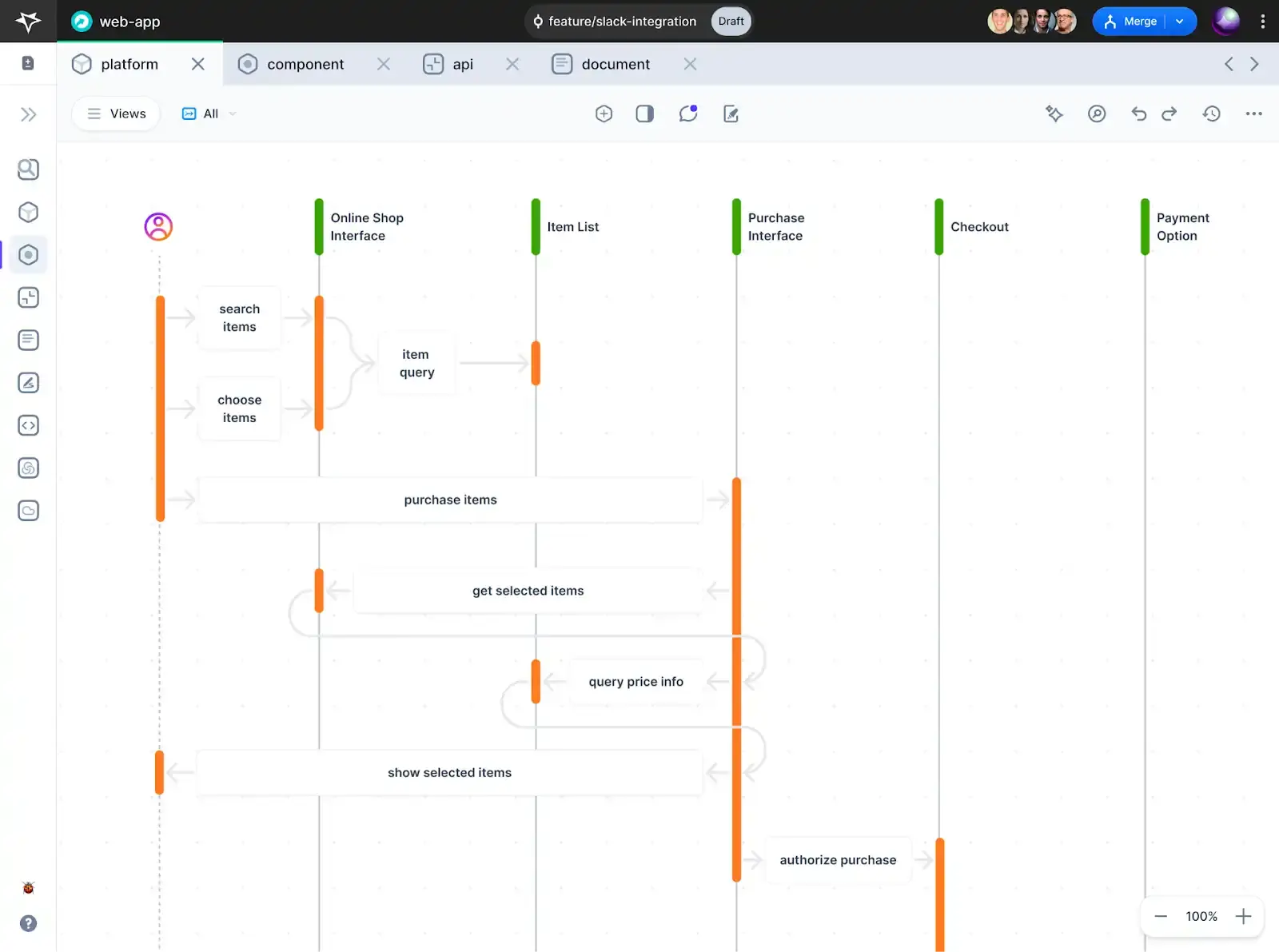 Use sequence diagrams for a more specific look at system functionalities. These diagrams depict the interactions between services in responding to queries, handling user authentication and authorization, and delivering resources. The sequence diagram below shows the order placement process of an online store.